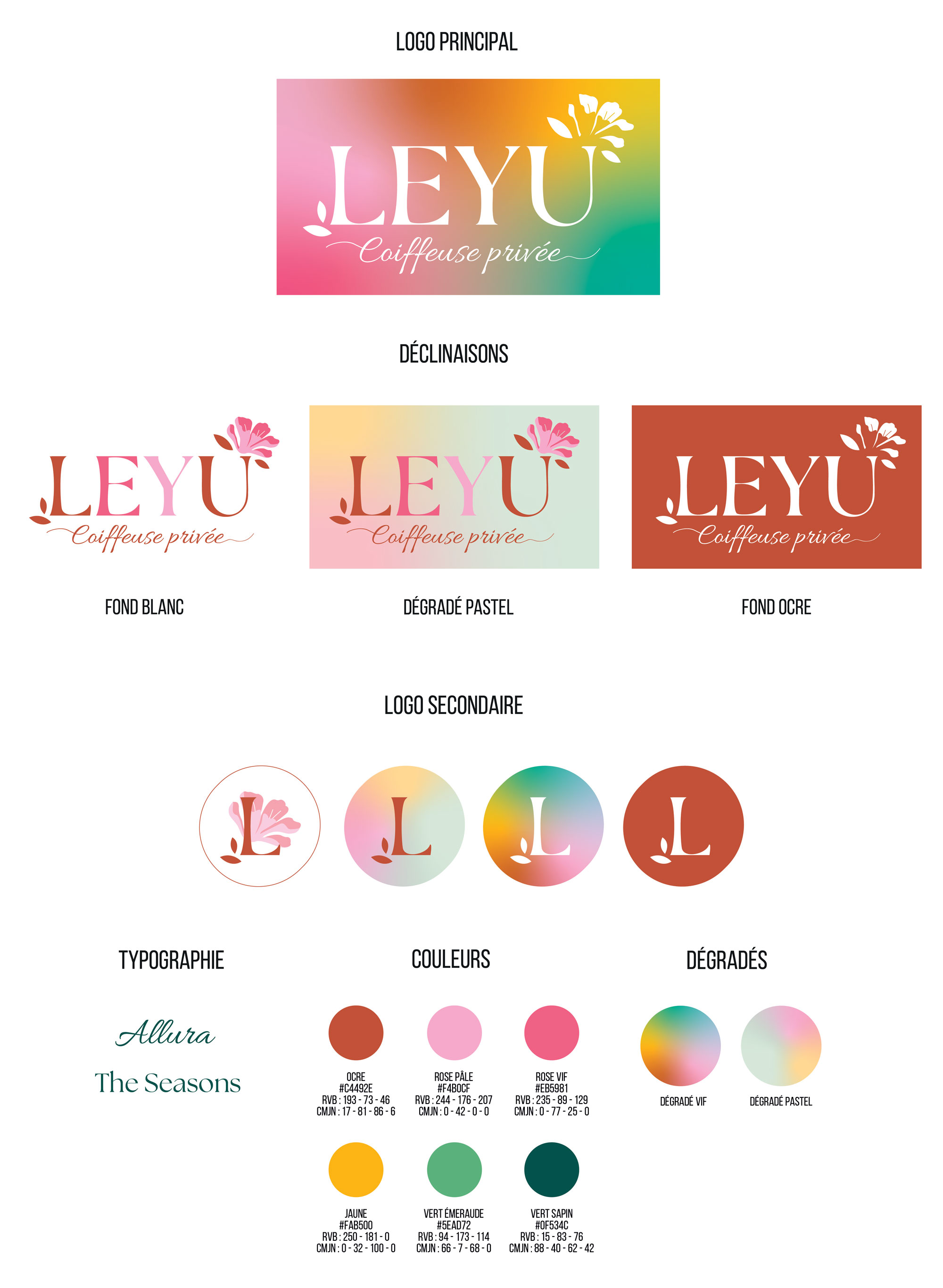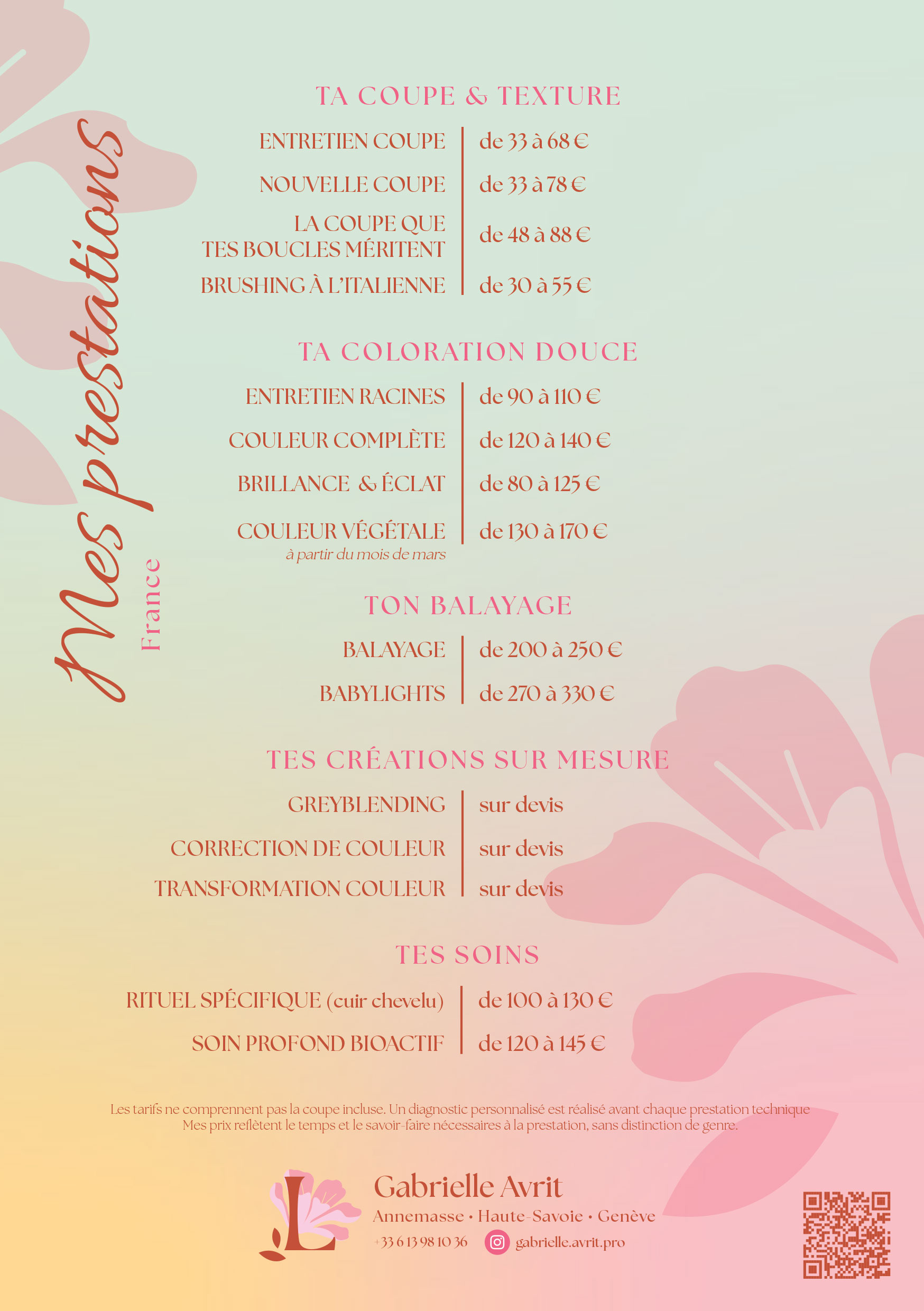 Gabrielle Avrit est coiffeuse à domicile et souhaitait lancer son activité avec une identité visuelle pep’s et colorée, à l’image de sa personnalité. L’idée était de retranscrire la douceur et la féminité à travers un logo floral, une typographie légère et fine. Création et dessin du logo ainsi que ses déclinaisons (logo principal et secondaire), mise en page de sa carte de visite et sa carte des prix.